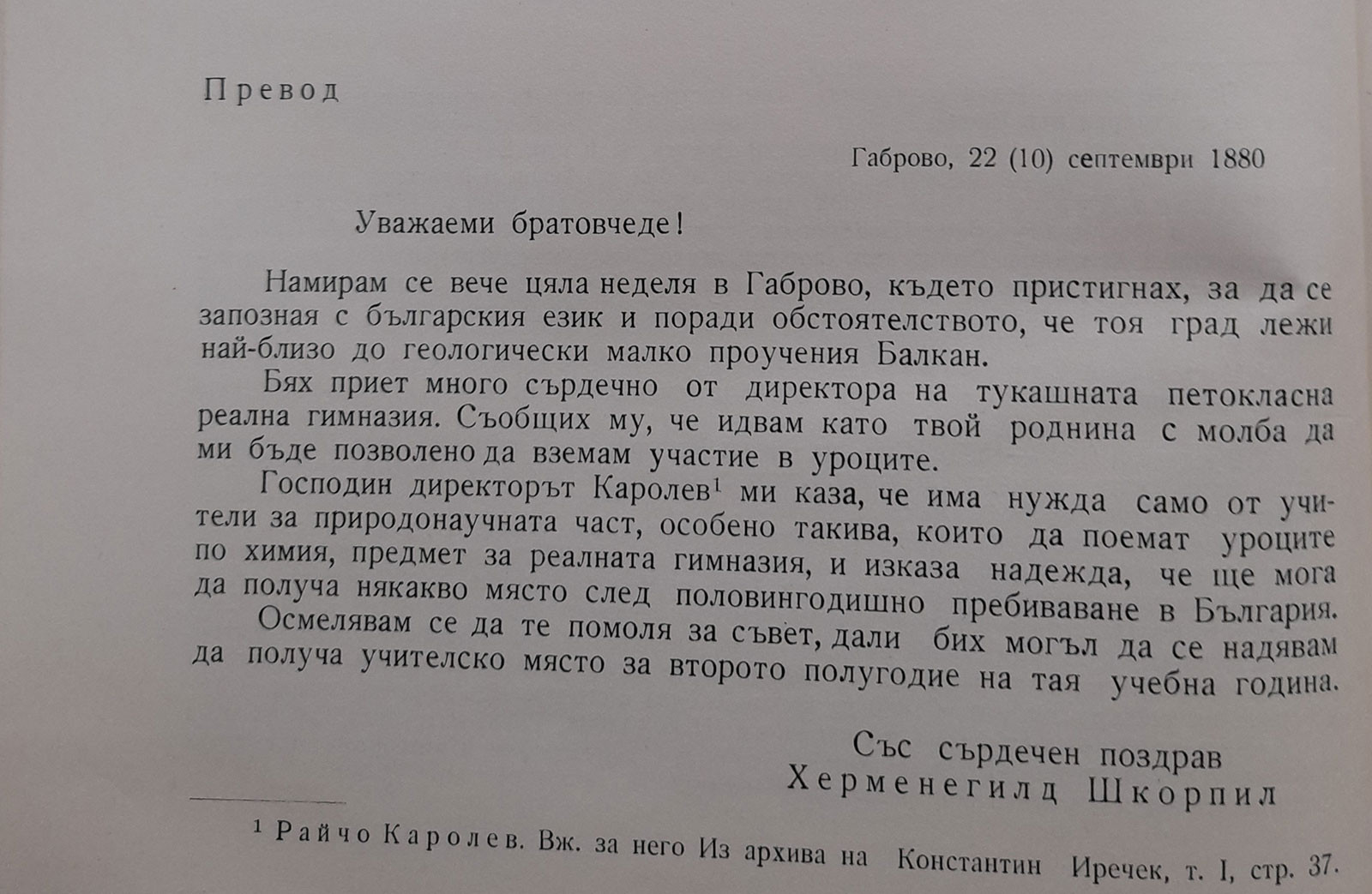 Хермин пристига първо в Габрово. От писмо до братовчед му Константин Иречек, с дата 22 /10/ септември 1880 г., разбираме че той е пристигнал в града, с ясната идея да се запознае с българския език. И с голямата нагласа и намерения за едновременна изследователска дейност „поради обстоятелството, че тоя град лежи най-близо до геологически малко проучения Балкан“. Хермин описва сърдечният прием на Райчо Каролев, директор на габровската петокласна реална гимназия и изказва надеждата, без да отправя директно формулирана молба, за евентуално учителско назначение. Габрово е първият от няколкото български града в които е живял и работил Хермин Шкорпил - два пъти учител в Пловдив, след това в Сливен, София, Русе и във Варна, където се пенсионира. Хермин разбира прекрасно какви възможности му дава неговата нова родина. По собствено желание той се мести от град на град, за да може да опознае и да проучи по-добре уникалните природни богатства и скритите в нея древни съкровища.